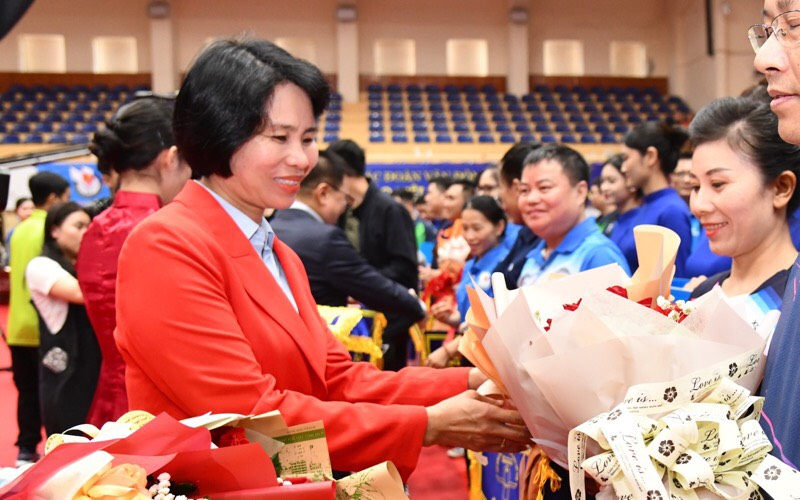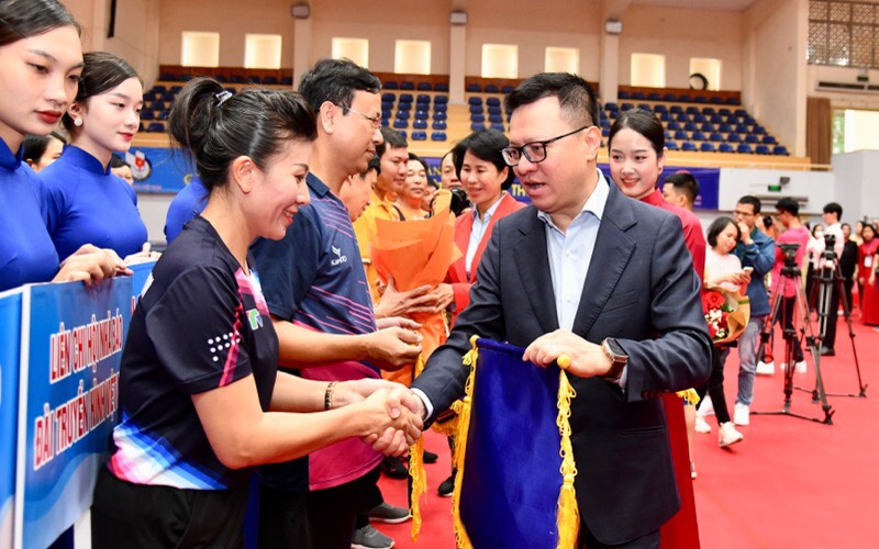 Phó Cục trưởng Cục TDTT Lê Thị Hoàng Yến trao hoa, cờ lưu niệm cho các đoàn tham dự