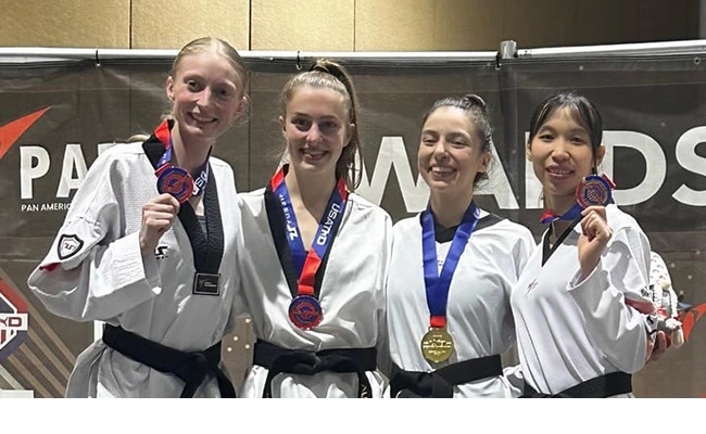 Trương Thị Kim Tuyền (ngoài cùng bên phải) trên bục nhận HCB giải taekwondo Mỹ mở rộng 2024