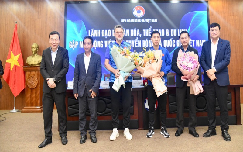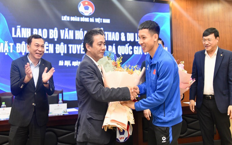 Thay mặt đội tuyển, ông Trần Anh Tú - Phó Chủ tịch Liên đoàn Bóng đá Việt Nam, Trưởng đoàn Bóng đá Việt Nam tham dự vòng loại thứ 2 World Cup 2026 và đội trưởng Đỗ Hùng Dũng đã gửi lời cảm ơn chân thành và nhận những bó hoa chúc mừng từ lãnh đạo Bộ VHTTDL, Cục TDTT và VFF đã luôn kịp thời động viên, đồng hành cùng đội tuyển Việt Nam trong suốt những chặng đường đã qua