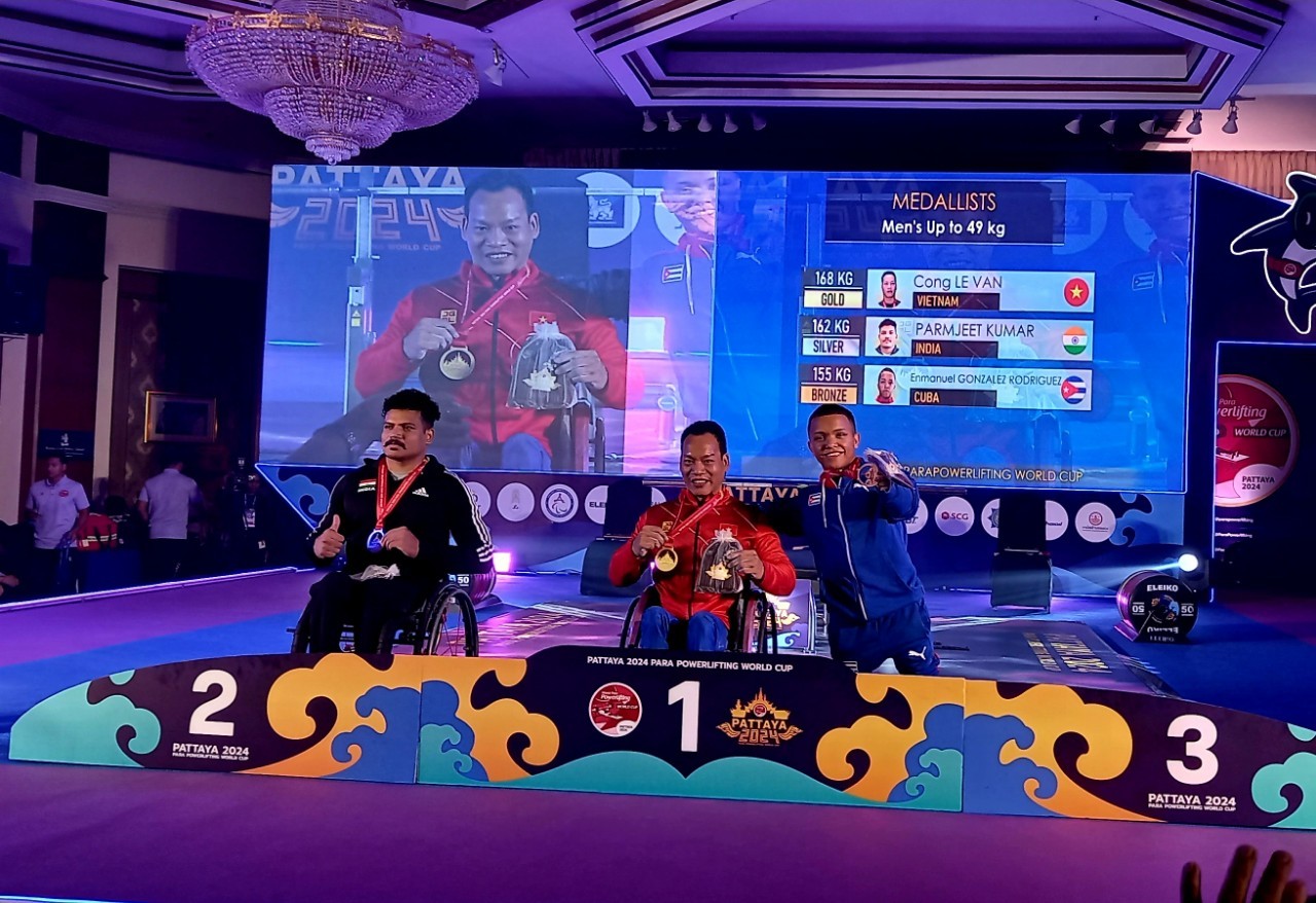 Lực sĩ Lê Văn Công (giữa) giành 2 huy chương vàng giải Cử tạ người khuyết tật vô địch thế giới 2024