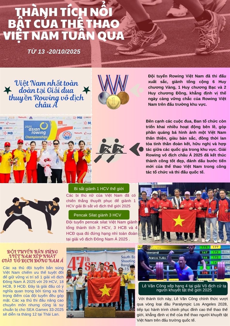Infographic: Thành tích nổi bật của Thể thao Việt Nam tuần qua Thể thao trong nước 20/10/2025 - 10:59 Trong tuần qua (13-20/10), các VĐV Việt Nam tiếp tục giành thành tích cao trên đấu trường thể thao quốc tế. Thông qua các giải đấu này các VĐV tiếp tục nâng cao trình độ chuyên môn, tích lũy kinh nghiệm thi đấu để chuẩn bị cho SEA Games 33 và các giải đấu quốc tế khác. KC