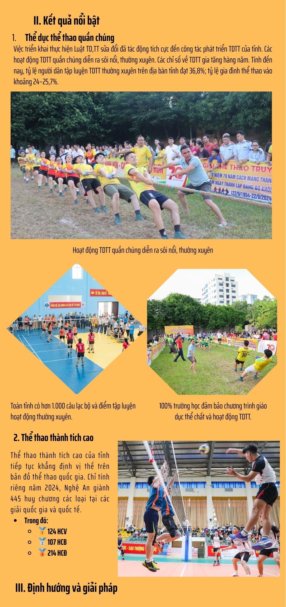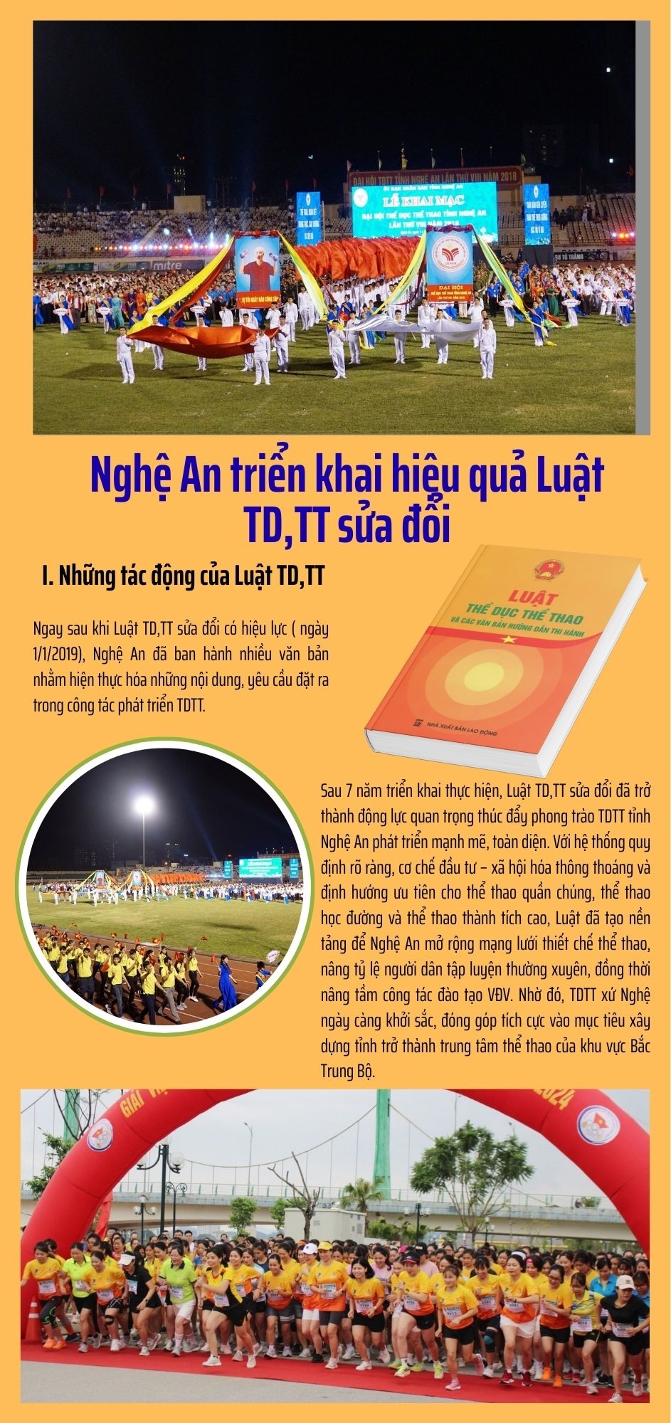 Inforgraphic: TDTT Nghệ An nhiều chuyển biến tích cực sau thực thi Luật TD,TT sửa đổi Hoạt động ngành Truyền thông chính sách 27/11/2025 - 06:35 Việc triển khai Luật Thể dục, Thể thao sửa đổi trên địa bàn tỉnh Nghệ An thời gian qua đã tạo chuyển biến rõ nét trong phong trào rèn luyện thân thể và công tác quản lý nhà nước về TDTT. Hệ thống văn bản hướng dẫn được ban hành kịp thời, cơ sở vật chất từng bước được đầu tư, cùng tỷ lệ người dân tham gia tập luyện thường xuyên ngày càng tăng. Từ trường học đến cộng đồng, các hoạt động thể thao ngày càng sôi nổi, góp phần xây dựng đời sống văn hóa lành mạnh và thúc đẩy phong trào TDTT phát triển bền vững. VD