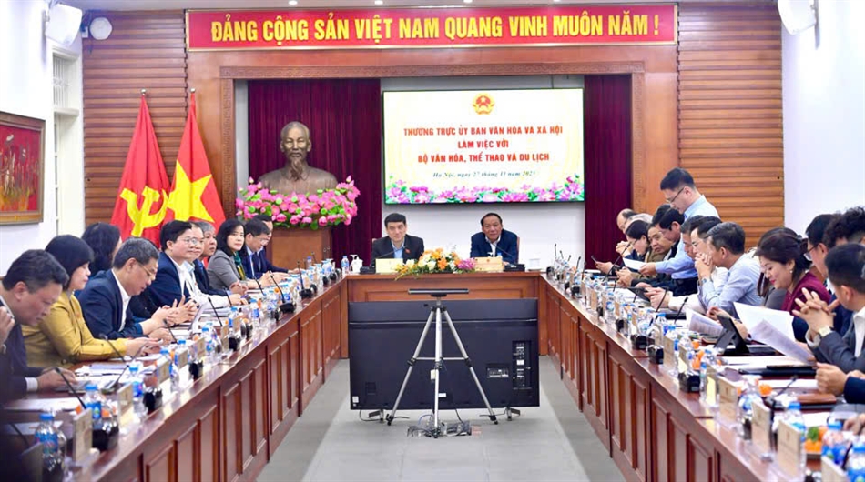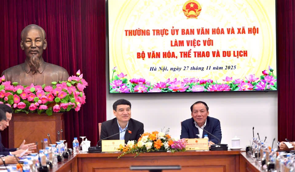 Bộ trưởng Bộ VHTTDL Nguyễn Văn Hùng và Chủ nhiệm Ủy ban Văn hóa và Xã Hội Nguyễn Đắc Vinh đồng chủ trì buổi làm việc