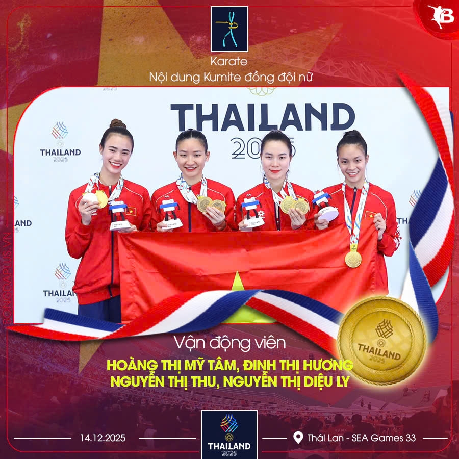 Trận chung kết môn Karate nội dung Kumite đồng đội nữ giữa các võ sĩ Việt Nam gồm: Nguyễn Thị Diệu Ly, Hoàng Thị Mỹ Tâm, Đinh Thị Hương và Nguyễn Thị Thu gặp các võ sĩ chủ nhà Thái Lan đã diễn ra kịch tính. Bước vào trận với tâm thế tự tin, cùng với sự chuẩn bị kỹ lưỡng về chuyên môn, các cô gái Việt Nam đã khẳng định được đẳng cấp của mình khi giành chiến thắng tuyệt đối với điểm số 2-0 để giành HCV thứ 3 cho đoàn Thể thao Việt Nam. Đây cũng là tấm HCV thứ 6 của Karate ở kỳ Đại hội lần này; đồng thời kết quả này cũng giúp đội tuyển Karate Việt Nam giữ vững vị trí số 1 nội dung kumite đồng đội nữ tại 3 kỳ SEA Games liên tiếp 31, 32 và 33.