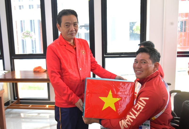Nhân dịp này, Thứ trưởng Hoàng Đạo Cương đã trao tặng quà và gửi lời chúc thi đấu thành công tới các đội tuyển của đoàn TTNKT Việt Nam, tiếp thêm niềm tin và động lực để các VĐV tự tin bước vào các cuộc tranh tài tại ASEAN Para Games lần thứ 13.