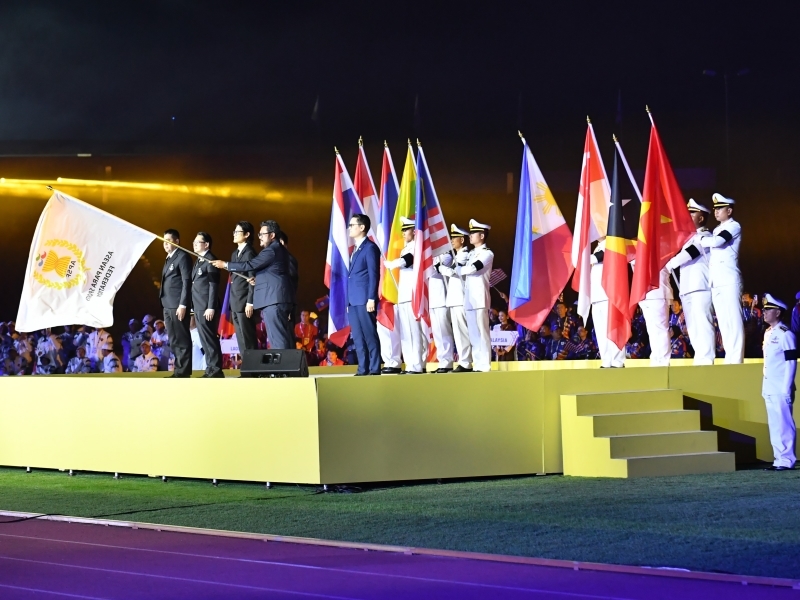 Phần diễu hành vào sân bắt đầu với nghi thức rước quốc kỳ các quốc gia, đoàn diễu hành của VĐV đến từ 10 quốc gia tham dự và linh vật “The San” tiến vào sân. Điểm nhấn của chương trình là màn trình diễn nghệ thuật đặc sắc “Isan Muan” do ban nhạc Mor Lam nổi tiếng Prathom Banthoeng Sin (Khon Kaen) thể hiện. Tiết mục đã biến sân vận động thành một không gian văn hóa Isan sôi động, truyền tải nét hấp dẫn của âm nhạc dân gian truyền thống hòa quyện cùng phong cách đương đại, khép lại ngày hội thể thao trong không khí rực rỡ và giàu cảm xúc.
