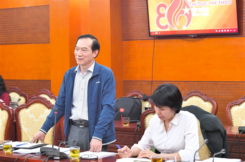 Cục trưởng Cục TDTT Việt Nam Nguyễn Danh Hoàng Việt báo cáo về công tác chuẩn bị chuỗi các hoạt động sự kiện kỷ niệm 80 năm ngày truyền thống ngành TDTT