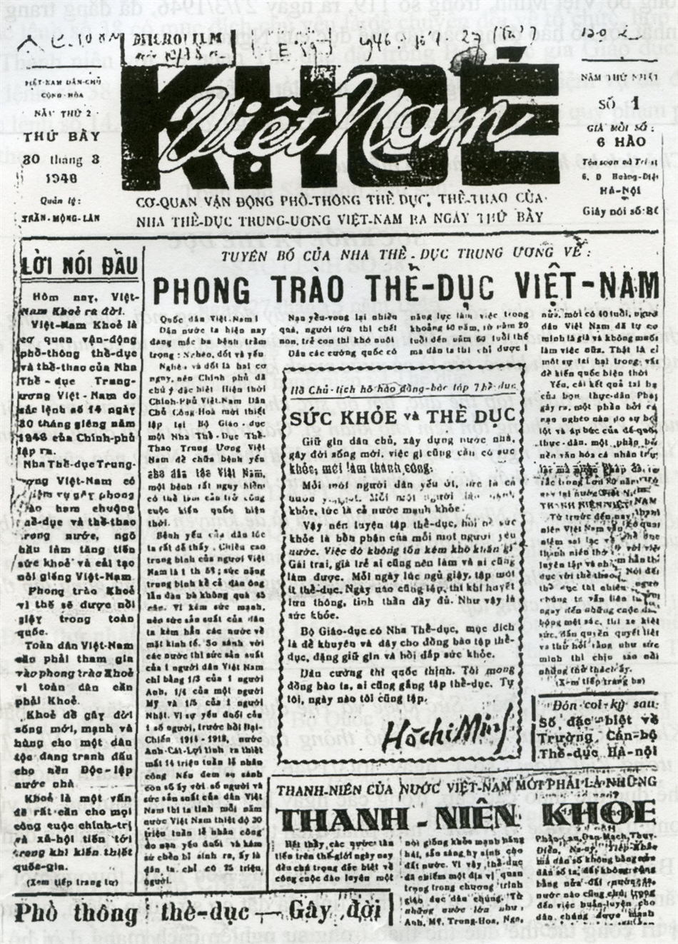 Lời kêu gọi toàn dân tập thể dục" của Chủ tịch Hồ Chí Minh đăng tải trên ấn phẩm Việt Nam Khỏe năm 1946.