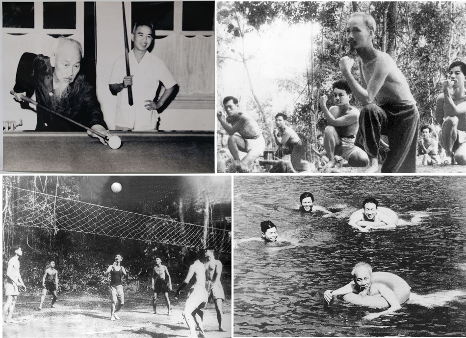 Bác Hồ tập luyện các môn thể thao như: Bóng chuyền, võ thuật, bơi, bi-a...