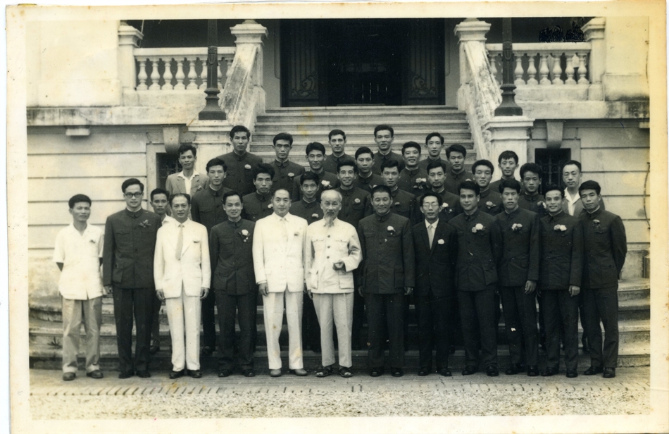 Bác Hồ và Thủ tướng Phạm Văn Đồng chụp ảnh lưu niệm cùng các vận động viên giành thành tích cao tại Đại hội Ganefo 1966