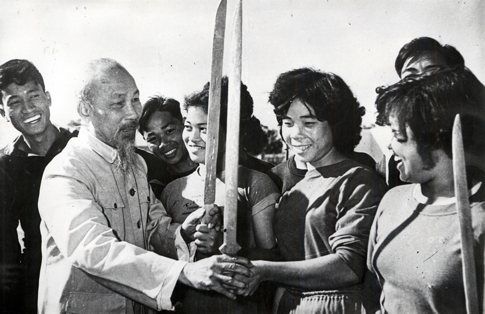 Bác Hồ sửa động tác cầm kiếm cho học sinh Trung cấp Thể dục thể thao Trung ương trong chuyến Người về thăm trường ngày 14/12/1961.