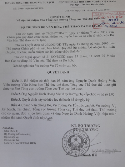 Bộ trưởng Bộ VHTTDL vừa ban hành Quyết định 3989/QĐ-BVHTTDL về việc bổ nhiệm Phó Tổng cục trưởng Tổng cục TDTT. Theo Quyết định này, ông Nguyễn Danh Hoàng Việt - Viện trưởng Viện Khoa học TDTT, Tổng cục TDTT được bổ nhiệm giữ chức vụ Phó Tổng cục trưởng Tổng cục TDTT. Thời hạn bổ nhiệm là 05 năm kể từ ngày ký Quyết định (14/11/2019).