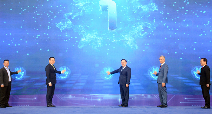 Các đồng chí lãnh đạo ấn nút khai mạc Triển lãm (Ảnh:QM)
