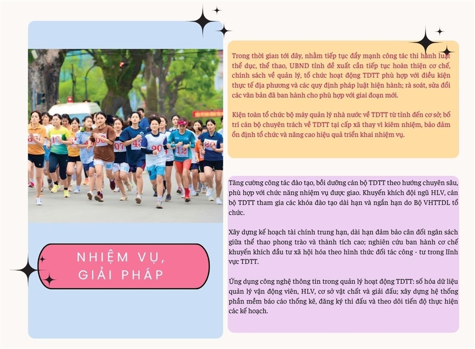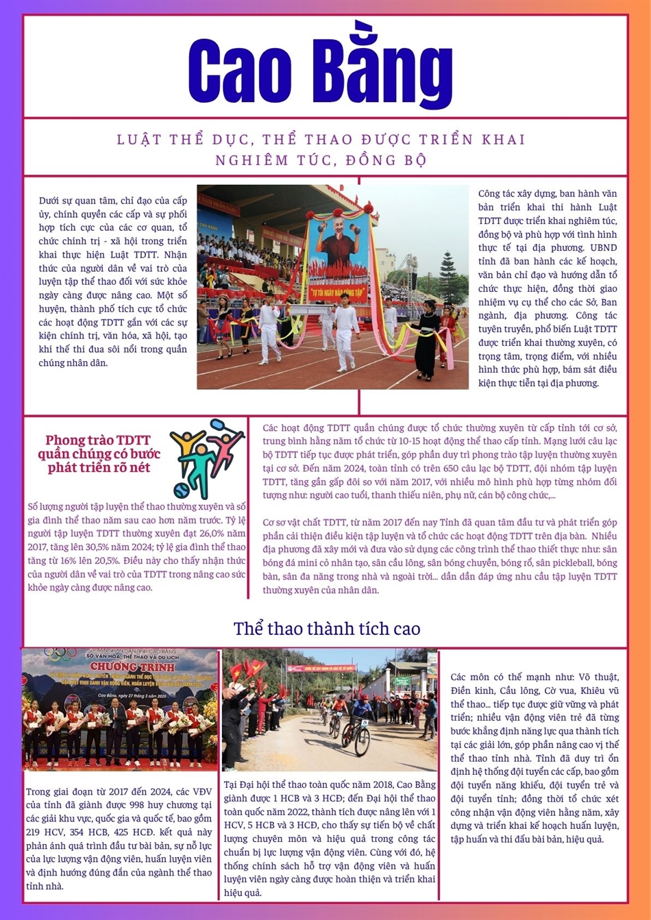 Infographic: Cao Bằng - những kết quả đạt được trong việc triển khai thực hiện Luật Thể dục, thể thao Hoạt động ngành Truyền thông chính sách 05/10/2025 - 06:23 Dưới sự quan tâm, chỉ đạo của cấp ủy, chính quyền các cấp tỉnh Cao Bằng và sự phối hợp tích cực của các cơ quan, tổ chức chính trị - xã hội trong triển khai thực hiện Luật TD,TT, nhận thức của người dân về vai trò của luyện tập thể thao đối với sức khỏe ngày càng được nâng cao. Các hoạt động TDTT gắn với các sự kiện chính trị, văn hóa, xã hội từ tỉnh đến cơ sở được tổ chức thường xuyên đã tạo khí thế thi đua sôi nổi trong quần chúng nhân dân. KC