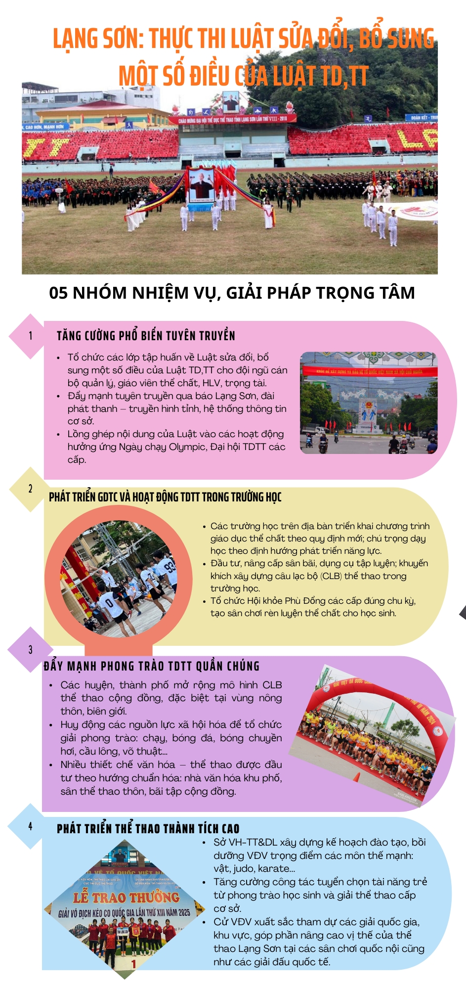 Lạng Sơn: Những kết quả tích cực trong thực hiện Luật Sửa đổi, bổ sung một số điều của Luật Thể dục, thể thao Truyền thông chính sách 28/11/2025 - 06:26 Sau khi Luật Sửa đổi, bổ sung một số điều của Luật Thể dục, thể thao có hiệu lực, tỉnh Lạng Sơn đã triển khai đồng bộ nhiều giải pháp nhằm đưa các quy định mới của luật vào thực tiễn đời sống. UBND tỉnh chỉ đạo Sở Văn hóa, Thể thao và Du lịch chủ trì tham mưu xây dựng kế hoạch thực hiện; phối hợp với các sở, ngành, địa phương tổ chức tuyên truyền, tập huấn cho cán bộ quản lý TDTT cấp huyện, xã và các cơ sở giáo dục về những điểm mới trong Luật. VD