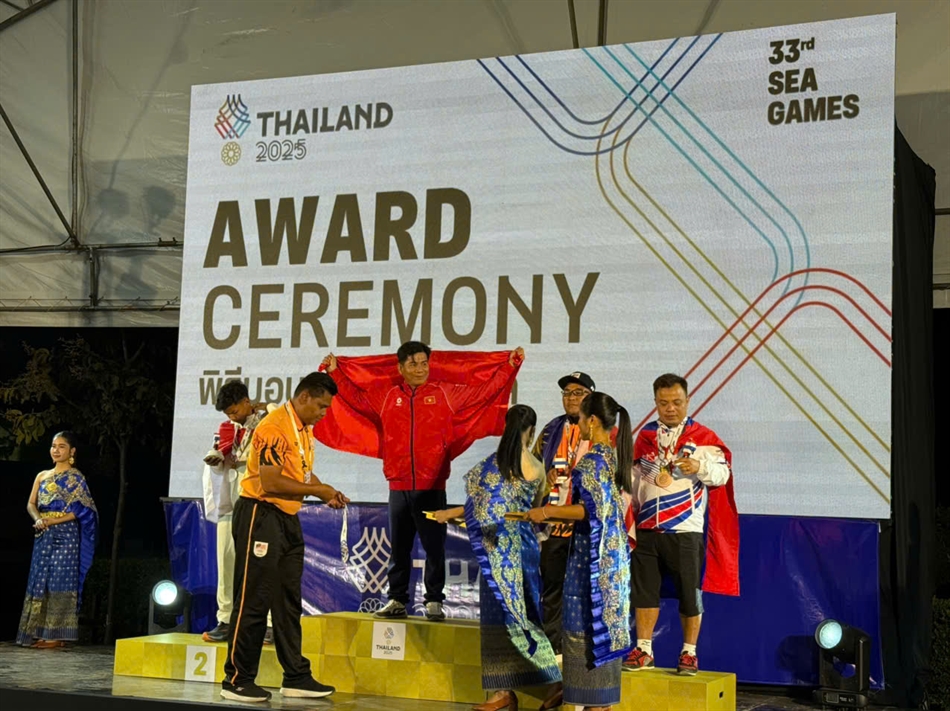 VĐV Nguyễn Văn Dũng trên bục nhận HCV tại SEA Games 33 (Ảnh: ST)