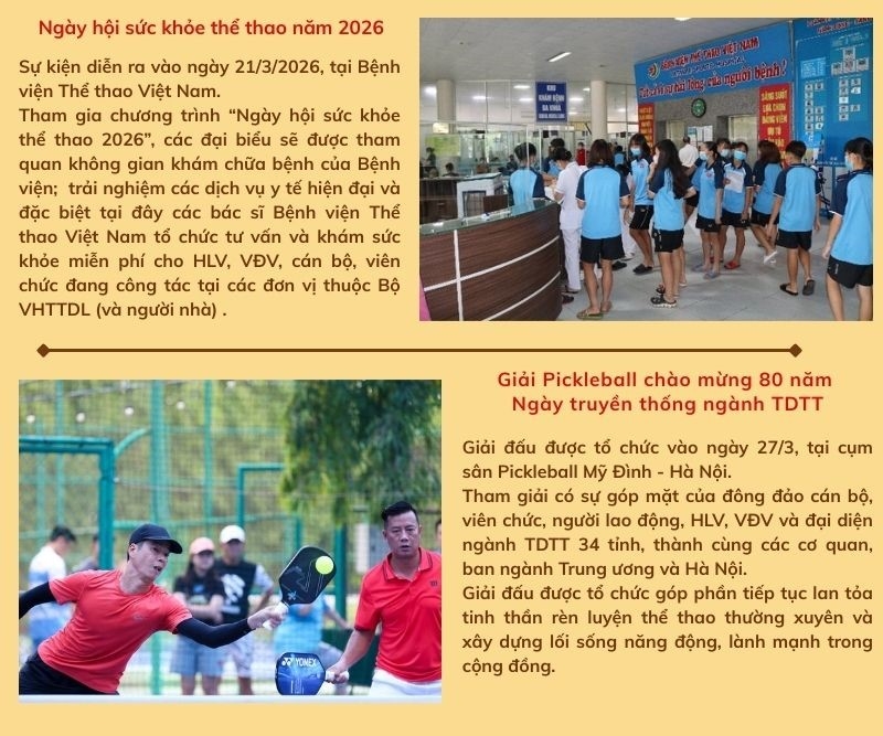 Infographic: Những sự kiện nổi bật kỷ niệm 80 năm Ngày truyền thống ngành TDTT Hoạt động ngành 21/03/2026 - 06:15 Hòa chung không khí hướng tới lễ kỷ niệm 80 năm Ngày truyền thống ngành TDTT (27/3/1946-27/3/2026), nhiều hoạt động, sự kiện thể thao ý nghĩa do Bộ VHTTDL, Cục TDTT Việt Nam và các đơn vị liên quan tổ chức. Cùng Trang tin điện tử TDTT điểm lại những sự kiện nổi bật sẽ diễn ra trong tháng 3 lịch sử này. VD